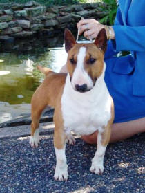 “Blade” is two years old with a distinguished record in the U.K. He was Best In Show, Miniature Bull Terrier Club of England 2004 and has 2 CC’s and 2 Res.CC’s. In Ireland, his record is equally impressive with Ch. Show Terrier Group winner in Ireland (only MBT to ever win a Group in Ireland) and Blade was Top Mini Bull in Ireland 2004.